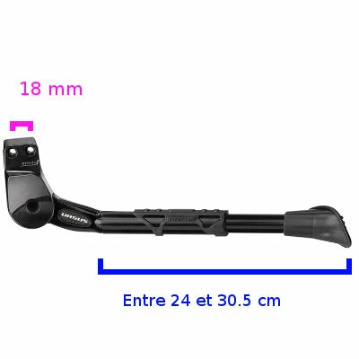 De coloris noir, la béquille Ursus se monte à l’arrière du vélo au niveau des haubans via deux vis fournies. L’espace de fixation entre les deux trous est de 18 mm. Facilement ajustable en hauteur (entre 26.5 et 31 cm) par une vis, la béquille est compatible avec des vélos 27.5 et 28 pouces.