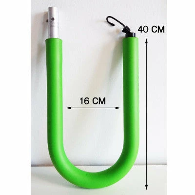 Le support planche Pat Racks se compose d’un support et de bras en U. Ces bras sont recouverts d’une mousse de protection des rails et de la planche épaisse de 12 mm et de couleur verte fluo, afin d’être bien visible sur la route. Ces bras sont également amovibles. Démontables en quelques secondes, vous pouvez ainsi les retirer lorsque vous ne transportez pas la planche, tout en gardant le support installé sur le vélo. De plus, les deux bras s’ajustent facilement au niveau du porte-bagages pour être plus ou moins écartés selon vos besoins. La photo 4 vous montre les dimensions des bras. Un tendeur est placé à chaque extrémité des bras. Ils sont à fixer au niveau de la base du support pour un bon maintien de la planche.