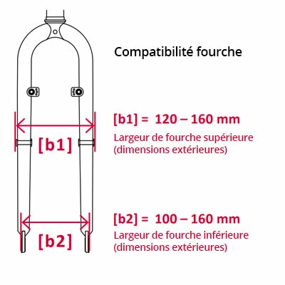 - Au niveau supérieur de la fourche : largeur externe entre 120 et 160 mm